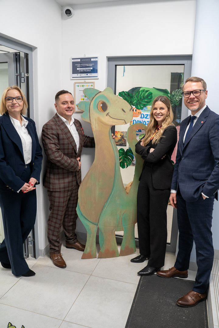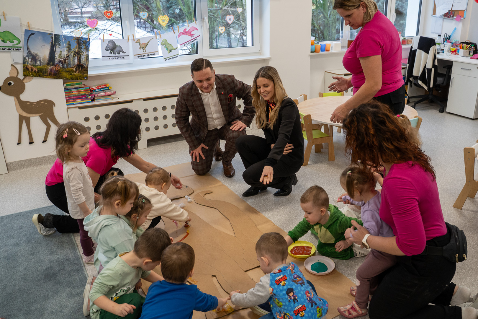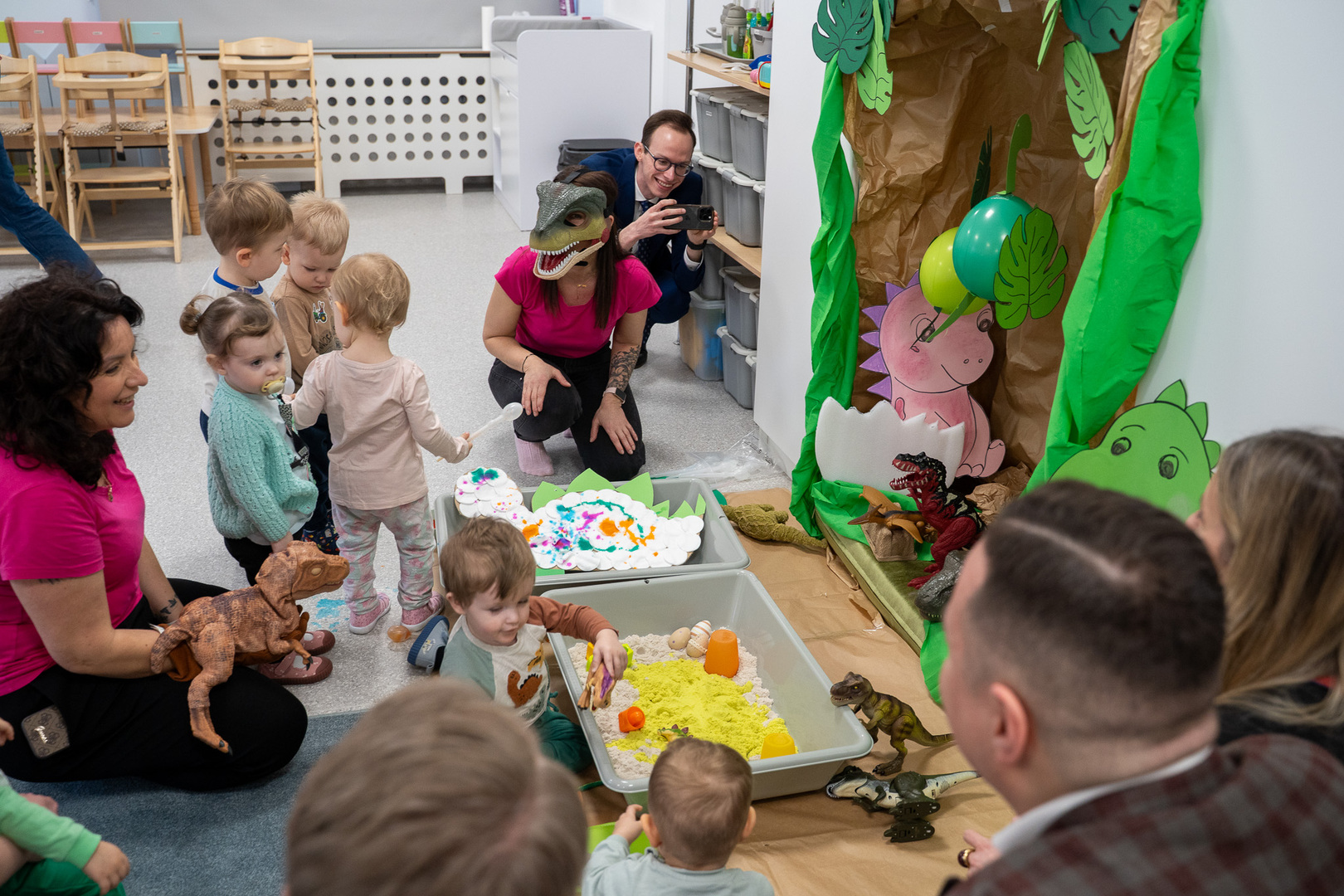 Tym razem zamiast slajdów były sale zajęć, korytarze, zaplecza i rozmowy z kadrą. A że w żłobku akurat obchodzono Dzień Dinozaura, goście trafili na kolorowe dekoracje i tematyczne aktywności, które, jak mówią opiekunowie, pomagają maluchom uczyć się świata „przez zabawę” i oswajać nowe sytuacje.
