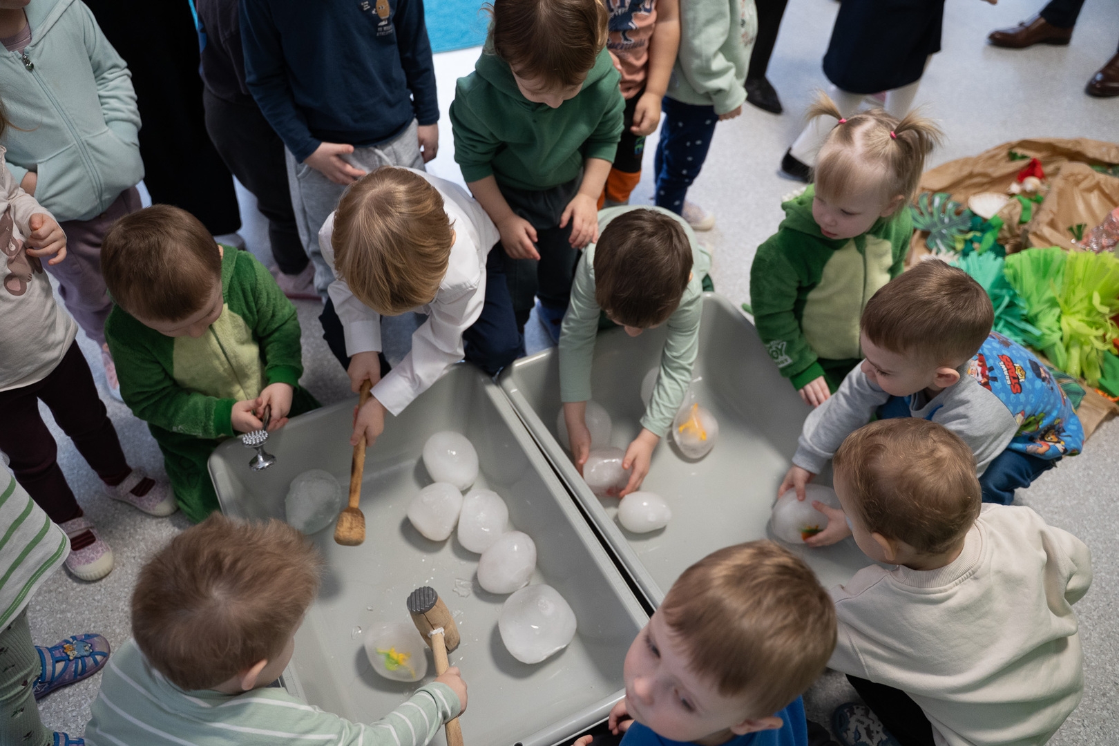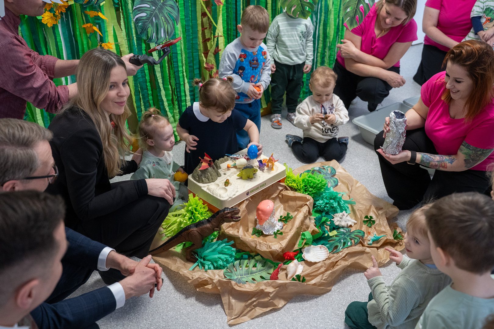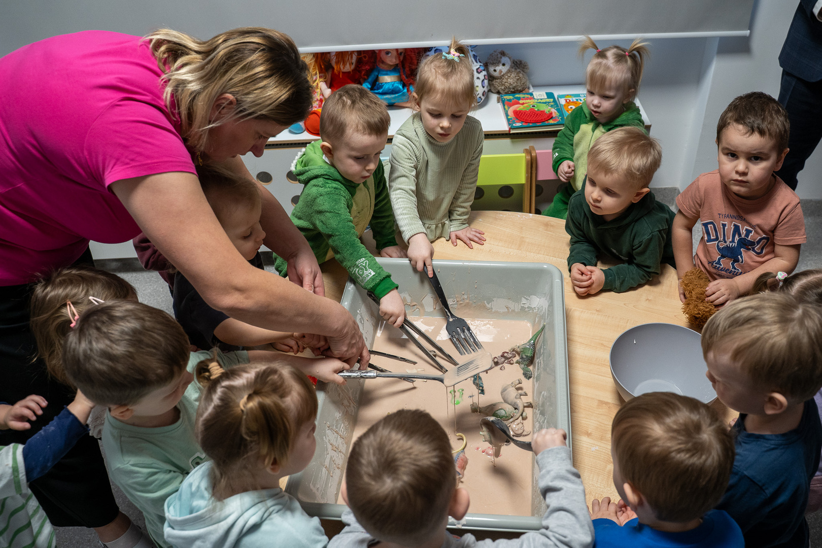 Tym razem zamiast slajdów były sale zajęć, korytarze, zaplecza i rozmowy z kadrą. A że w żłobku akurat obchodzono Dzień Dinozaura, goście trafili na kolorowe dekoracje i tematyczne aktywności, które, jak mówią opiekunowie, pomagają maluchom uczyć się świata „przez zabawę” i oswajać nowe sytuacje.