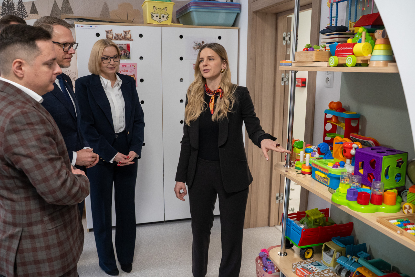 Gości po obiekcie oprowadziła dyrektor placówki Wioleta Maziarz-Anisiewicz, pokazując rozwiązania, które z perspektywy rodziców często mają kluczowe znaczenie ergonomiczne szatnie, wózkownię, dostępność komunikacyjną budynku czy przyjazne zaplecza przy salach. W żłobku działa sześć nowoczesnych sal zajęć (każda z zapleczem), a jedna z nich pełni funkcję Sali Doświadczania Świata, nazywanej też salą zmysłów.