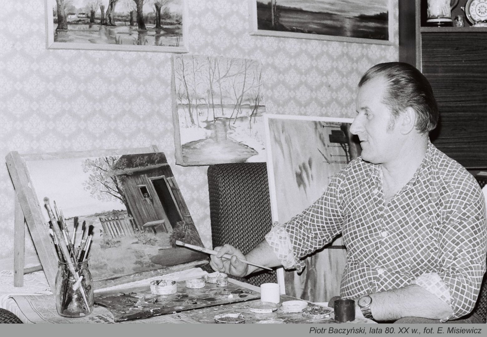 Piotr Baczyński urodził się w 1942 roku w Świerszczowie. Z Łęczną związany był od 1978 roku, gdzie przez lata aktywnie uczestniczył w życiu kulturalnym miasta. Był współtwórcą i pierwszym liderem środowiska plastycznego, które z czasem przekształciło się w Grupę Inicjatyw Plastycznych i Fotograficznych „Plama”. To właśnie on w 1983 roku zainicjował integrację lokalnych artystów, tworząc przestrzeń do wspólnej pracy i prezentacji twórczości. To rówineż radny II kadencji Rady Miejskiej w Łęcznej w latach 1994-1998 oraz Przewodniczący Komisji Kultury Sportu, Turystyki i Spraw Młodzieży.