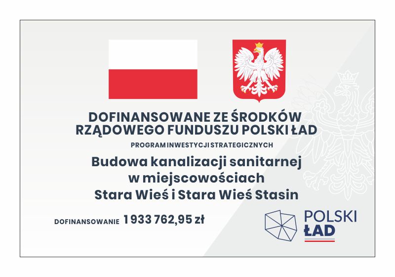 Przedsięwzięcie pn. „Budowa kanalizacji sanitarnej w miejscowościach Stara Wieś i Stara Wieś Stasin” zostało dofinansowane ze środków Rządowego Funduszu Polski Ład: Program Inwestycji Strategicznych.