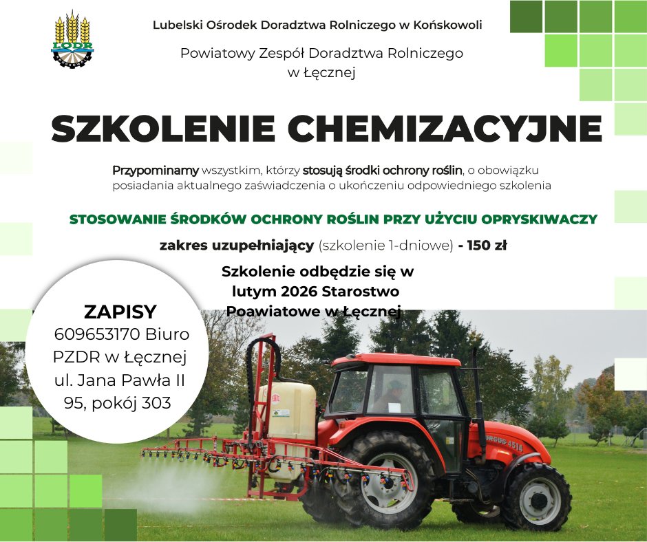 Powiatowy Zespół Doradztwa Rolniczego w Łęcznej, działający w strukturach Lubelski Ośrodek Doradztwa Rolniczego w Końskowoli, prowadzi nabór na uzupełniające szkolenie chemizacyjne dla rolników. Kurs skierowany jest do osób stosujących środki ochrony roślin przy użyciu opryskiwaczy i przypomina o obowiązku posiadania aktualnego zaświadczenia potwierdzającego ukończenie odpowiedniego szkolenia.