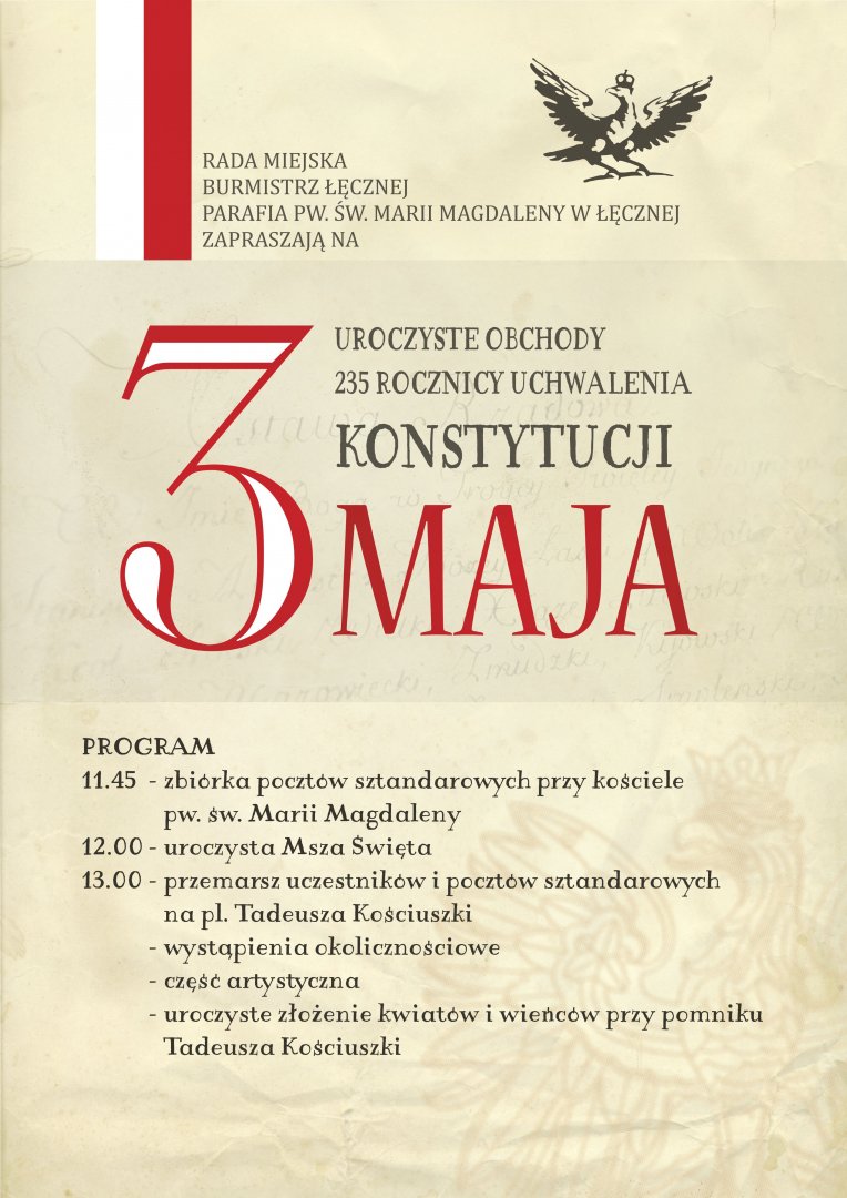 Rada Miejska, Burmistrz Łęcznej oraz Parafia pw. św. Marii Magdaleny w Łęcznej zapraszają na oficjalne obchody 235. rocznicy uchwalenia Konstytucji 3 Maja. Uroczystości odbędą się w niedzielę, 3 maja 2026 roku.