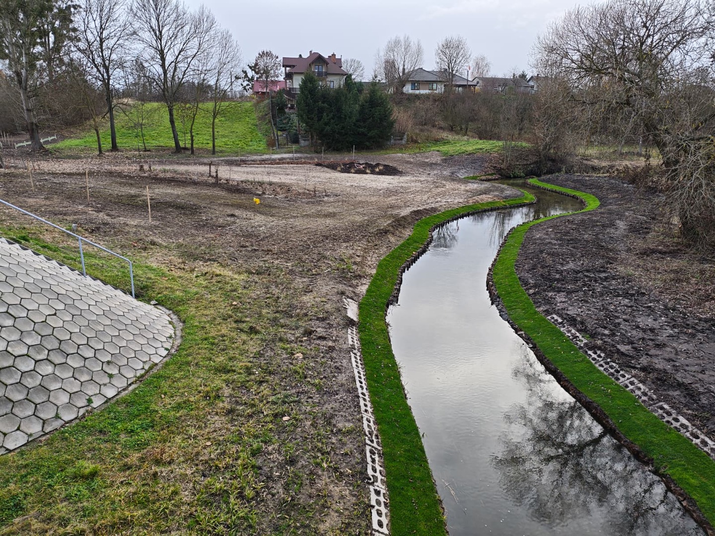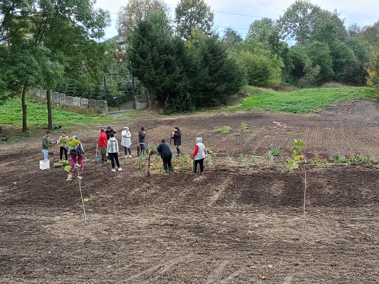 Prace trwały od sierpnia do listopada i objęły teren nad rzeką oraz obszar w pobliżu miejscowej remizy. Mieszkańcy wspólnie przystąpili do uporządkowania i ponownego zagospodarowania zielonej przestrzeni, która od lat czekała na zmianę. Usunięto wieloletnie chwasty, wyrównano teren, a następnie posadzono nowe drzewa, krzewy i byliny. Miejsca dotąd zaniedbane zyskały zupełnie nowe oblicze — jeszcze przed zimą wysiano trawę oraz łąkę kwietną, której pełny efekt będzie można podziwiać w przyszłym sezonie.